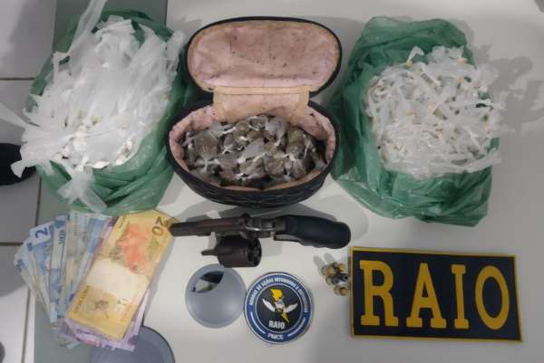 Um adolescente de 17 anos foi apreendido pela Polícia Militar do Ceará (PMCE), na noite dessa terça-feira (22), portando um revólver calibre 38 municiado; 455 pedras de crack (61g); 214 trouxinhas de cocaína (62g); 157g de maconha (149g) e R$ 177,00 em espécie. A apreensão aconteceu após uma abordagem do Comando de Policiamento de Rondas de Ações Intensivas e Ostensivas (CPRaio) ao indivíduo que transitava em atitude suspeita na rua Nova Granada, no bairro Marechal Rondon, em Caucaia-CE.