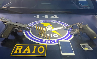 Um revólver calibre 38 e uma pistola calibre .40 foram apreendidos pelos policiais do Comando de Policiamento de Rondas e Ações Intensivas e Ostensivas (CPRaio) no município de Ubajara. O caso aconteceu na tarde da quarta-feira (20) quando a guarnição fazia patrulhamento no Bairro São Sebastião. De acordo com a PM, as armas estavam em posse de um jovem de 19 anos, o qual foi preso e conduzido à Delegacia de Tianguá, onde foi autuado por porte ilegal de arma de fogo.