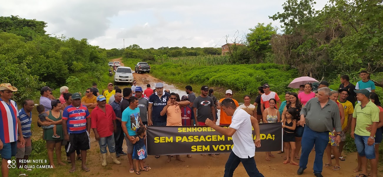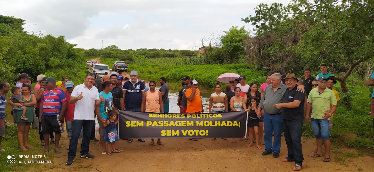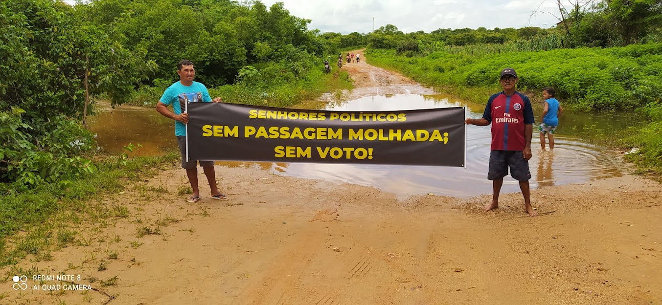 A promessa de uma construção de uma passagem molhada no local já se arrasta por 30 anos. Neste domingo, moradores reivindicaram seus direitos e cobraram dos vereadores e da gestão municipal a construção da estrutura, pois “senhores políticos: sem passagem molhada; sem voto!”.