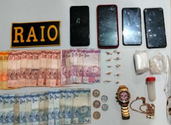 Após buscas no imóvel da suspeita, dez pedras de crack, uma quantia em dinheiro, uma corrente dourada, um relógio, alguns sacos plásticos utilizados para embalar drogas e quatro aparelhos celulares foram localizados.