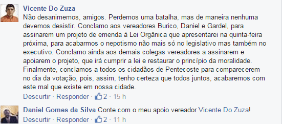 Depois da votação que OFICIALIZOU o Nepotismo na Câmara Municipal de Pentecoste, o vereador Vicente do Zuza, em comentário na rede social conclamou os outros vereadores que votaram contra essa pratica no parlamento pentecostense (Burico, Daniel e Gardel), para assinarem um projeto de emenda à Lei Orgânica que deverá apresentar na próxima quinta-feira, 21 de maio, para acabar o “Nepotismo” não mais só no legislativo, mas também no executivo. Vicente também pediu a sensibilidade dos demais colegas vereadores a assinarem e apoiarem o projeto, que irá cumprir a lei e restaurar o princípio da moralidade no município.